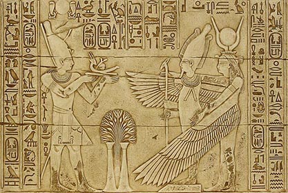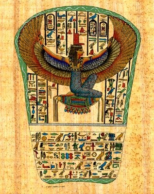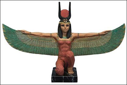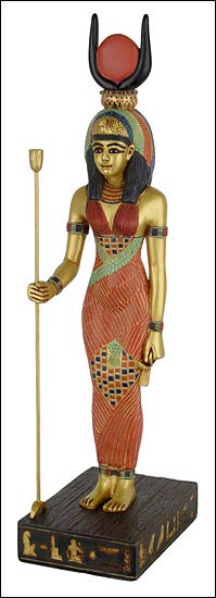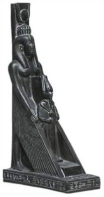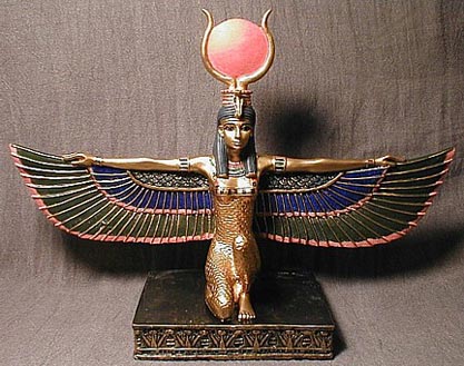 Isis is the daughter of Geb and Nut. She is the twin sister of Nepthys (the sister-wife of Set). Her brother Osirus is her husband, and after his death, she conceives the child Horus the Younger with him using magical means. Isis is a goddess of magic and healing. She is typically depicted as a human with a throne-shaped headpiece, as she is the "Queen of Heaven." Isis had a very powerful cult following, and she assimilated the traits and followers of several lesser goddesses, including Hathor, Mut, Selket, and Sekhmet. Indeed, after the assimilation of Hathor, Isis is then depicted wearing the cow-horns-and-sun-disc headpiece usually associated with Hathor. The Isis cult even had a significant impact on ancient Greece and Rome. It was finally banned by Christians in the 6th century A.D.